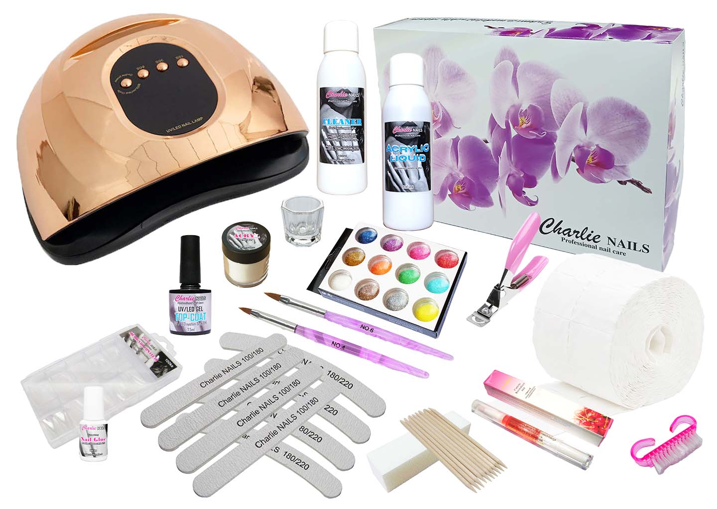 Akrylová sada na nehty vytváří velmi pevné a odolné nehty. Je vhodná pro středně pokročilé i professionály s velmi výkonnou UV/LED lampou 150W v zlaté barvě a veškerým potřebným vybavením. Pomocí akrylu docílíte krásných a velmi odolných nehtů s možností prodloužení na umělé tipy chráněné UV/LED gelem pro jejich dlouhou životnost. v pohodlí domova zvládne každý pomocí podrobného návodu. Příslušenství je pro vás uloženo v praktickém designovém boxu.