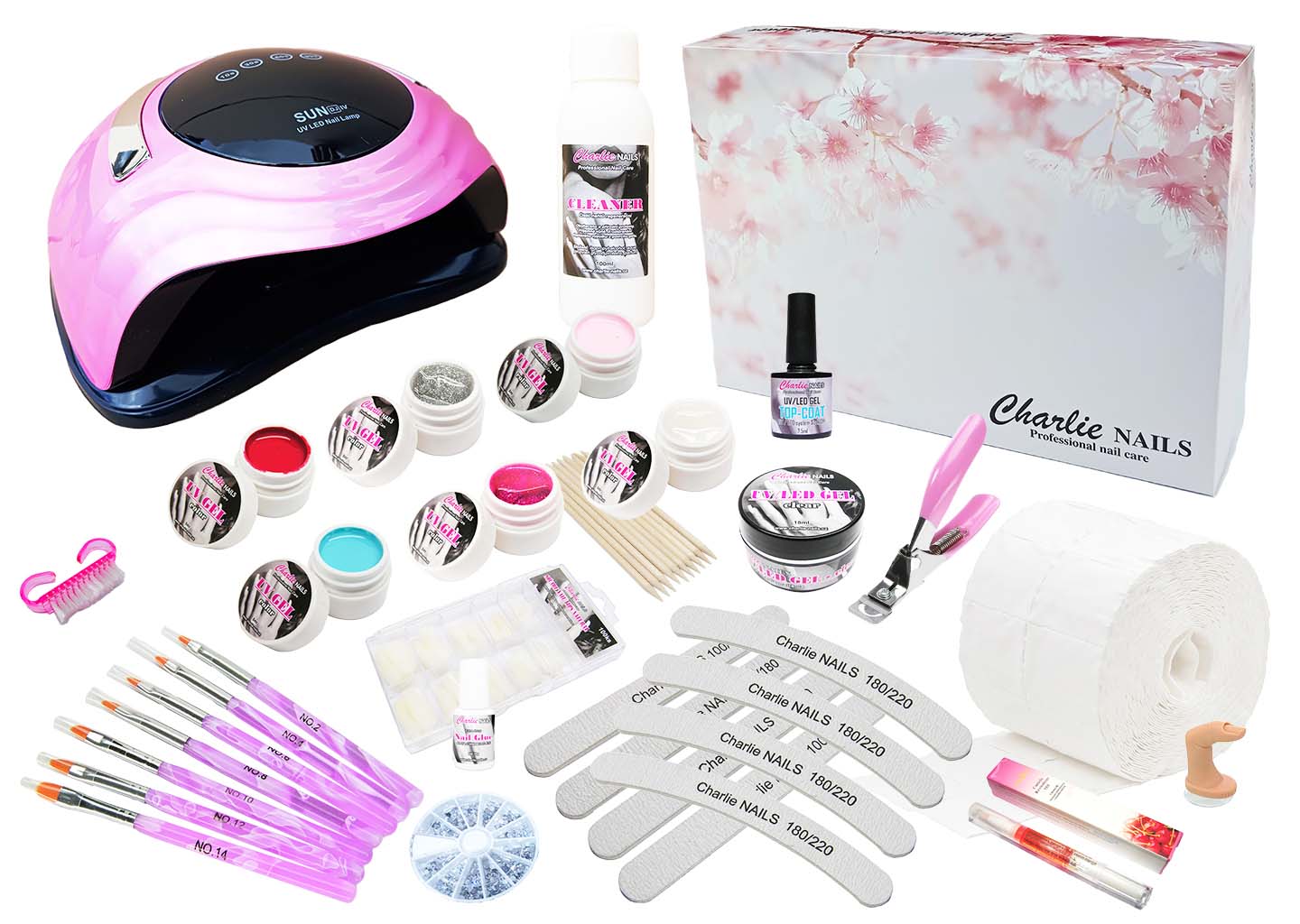 Oblíbená kompletní sada na gelové nehty. Je vhodná pro začátečníky i professionály s velmi výkonnou UV/LED lampou 168W v elegantní růžové barvě, 2ks.+6ks. UV/LED gelů s vlastním výběrem barev a veškerým potřebným vybavením pro krásné nehty v pohodlí domova zvládne každý pomocí podrobného návodu.