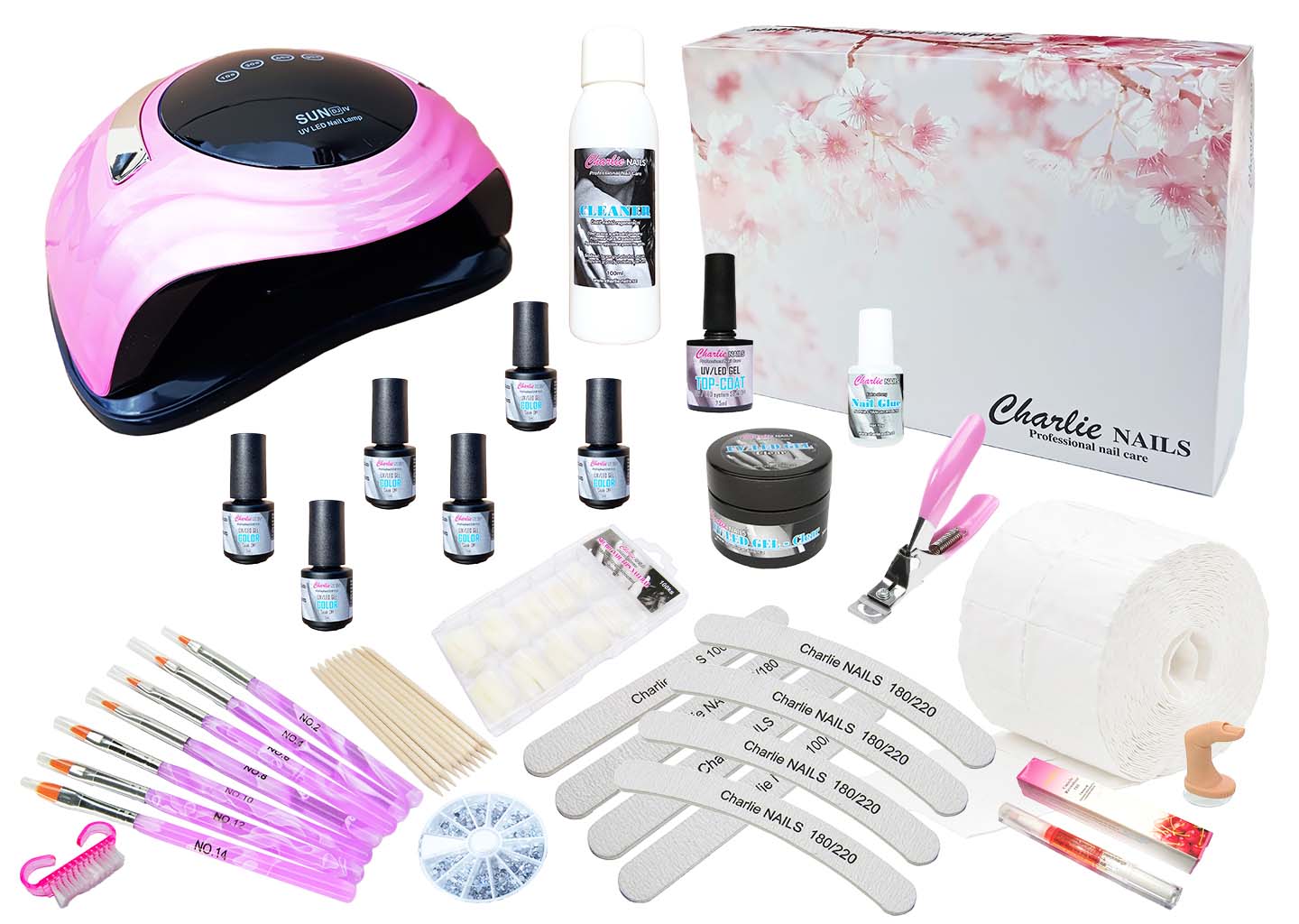Hybridní sada na gelové nehty. Je vhodná pro začátečníky i professionály s velmi výkonnou UV/LED lampou 168W v oblíbené růžové barvě, 2ks.UV/LED gelů + 6ks. UV/LED gel laků s vlastním výběrem barev a veškerým potřebným vybavením pro krásné nehty v pohodlí domova zvládne každý pomocí podrobného návodu. Příslušenství je pro vás uloženo v praktickém designovém boxu.